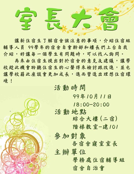 請各寢室的1號(第三宿舍為A)準時入場,室長大會10/11(一)。